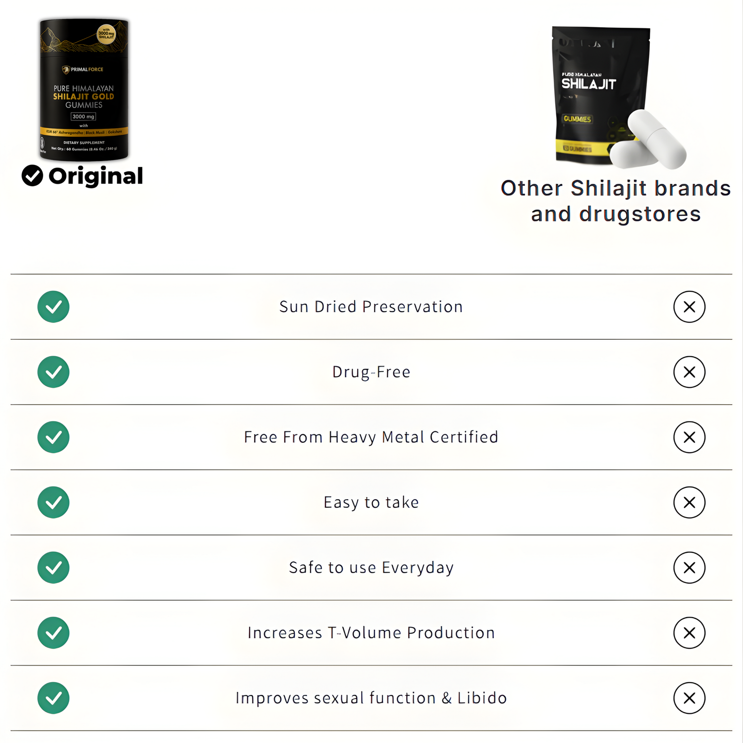 We don’t use weak doses or filler blends. It’s a clinically aligned, fully transparent formula with 3000 mg Shilajit equivalent, not the typical 100–200 mg tricks other brands use.